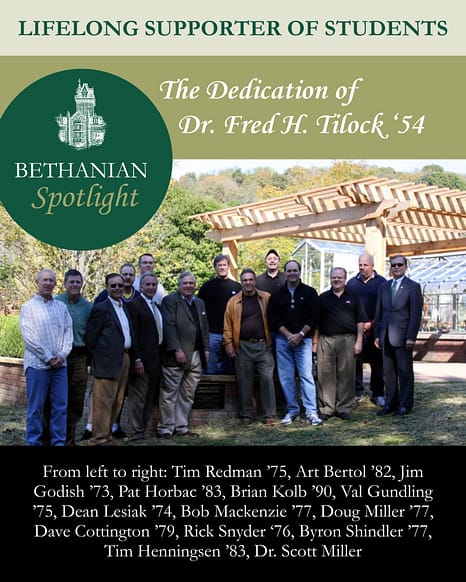 In 2010, Bethany honored his memory with the dedication of the Dr. Fred Tilock Amphitheatre. As then-President Dr. Scott Miller said, “this beautiful facility, a meeting place where on so many occasions we celebrate both Bethany’s foundation and future, will serve as a lasting testament to that dedication and faithfulness by honoring the memory of Beta brother Fred Tilock, one who embodied such qualities throughout his life.”
